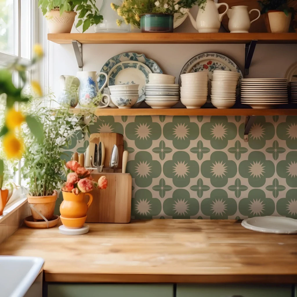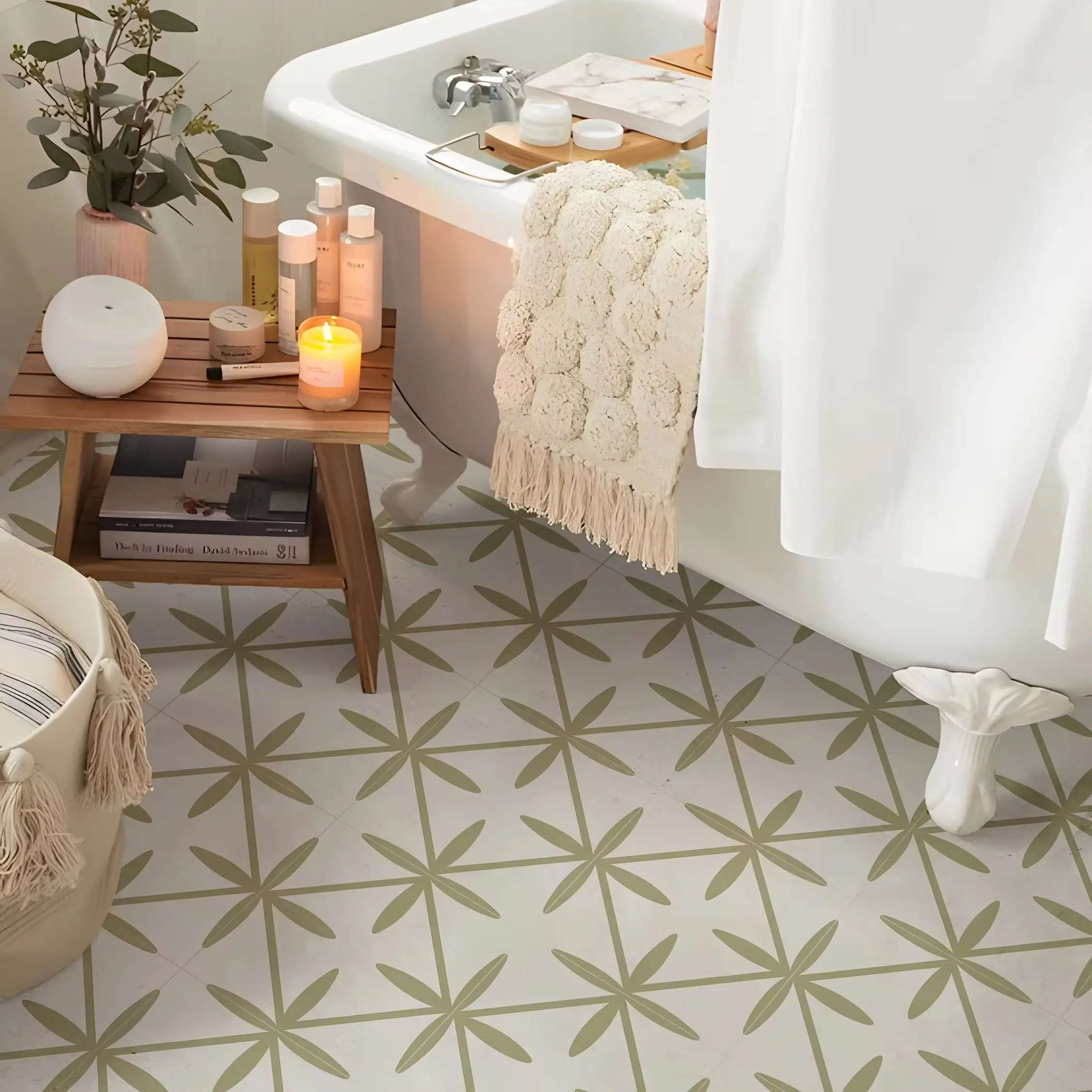 The bohemian design and sage color make these tiles versatile enough to complement a range of decor styles, from rustic to modern.